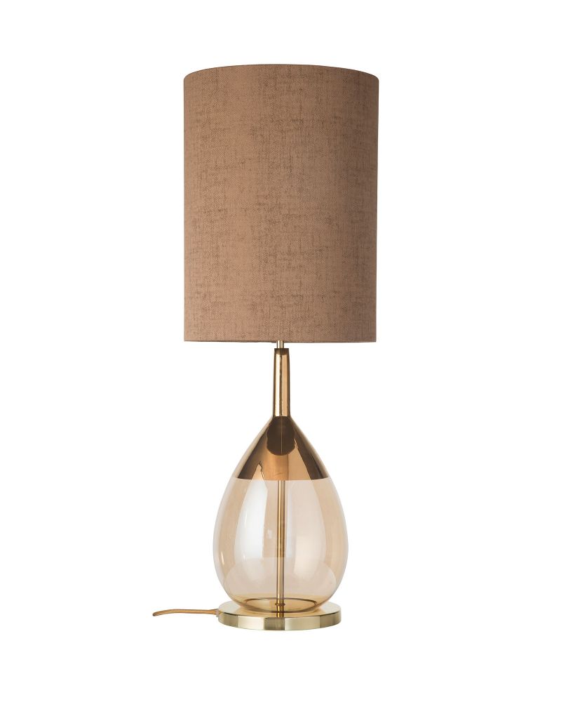 Her får du en mundblæst lampefod i dråbeform med gyldenfarvet glas.