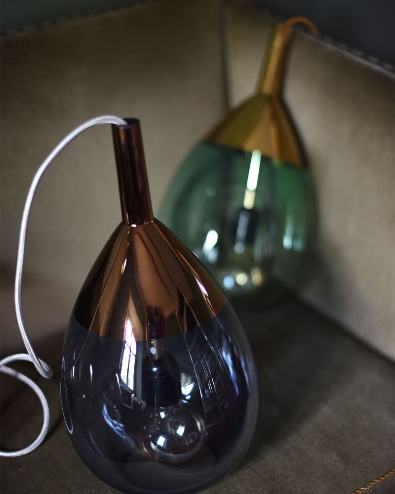 De mange smukke glas- og metalfarver giver et flot udtryk som kan indpasses i ethvert hjem. Den stilfulde lampe tager sig flot ud uanset om den bruges alene, i sæt eller i klynger med forskellige størrelser og/eller farver.