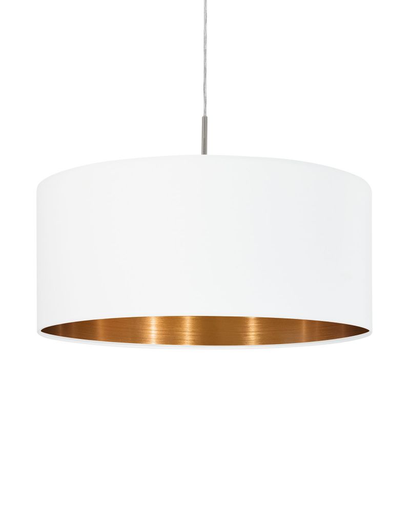 Den hvide pendel med kobberfarvet inderside findes i fire størrelser. Dette er den næstmindste model med en diameter på 53 centimeter. Du kan også vælge den lille model, som har en diameter på 38 centimeter. EGLO’s pendel findes i flere spændende farver: hvid, taupe, grå, antracit, sort/kobber og hvid/kobber.