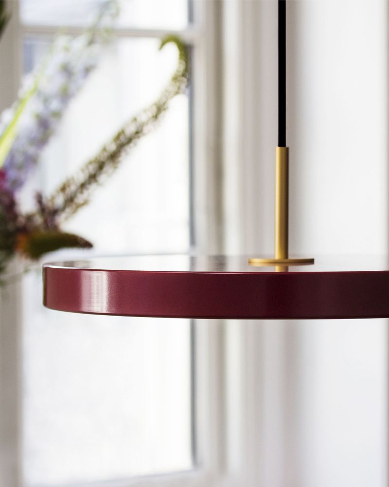 Den smukke Asteria lampe fås i 11 forskellige moderne farver, så uanset din personlige smag - og den indretning i hjemmet som lampen skal matche - kan du finde din favorit i det store udvalg. (Se hele Asteria serien her)Den rubin røde lampe kommer med en skøn messingdetalje på toppen der efter smag og behag kan udskiftes til enten stål eller sort. Lampen kommer desuden med 2,7 meter sort stofledning og matchende sort rosette.